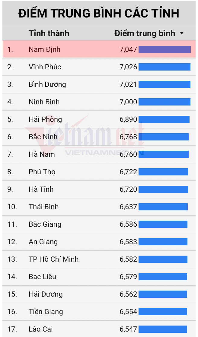 Ninh Bình đứng thứ 4 với trung bình 7 điểm. Địa phương này cũng dẫn đầu cả nước về điểm trung bình của thí sinh ở khối A.