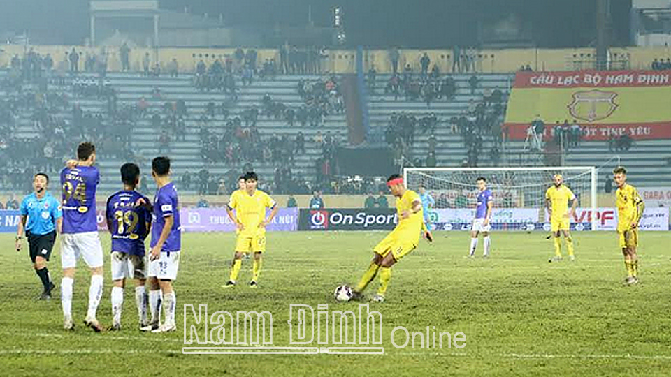 Sang hiệp 2, Hà Nội dồn lực tấn công nhưng các cầu thủ Nam Định thi đấu tập trung, phòng ngự kín kẽ. Đội bóng Thành Nam không ngại va chạm và phạm lỗi để làm gián đoạn các pha lên bóng của Hà Nội, đội khách không tạo ra được nhiều cơ hội đáng chú ý. Thời gian bù giờ trận đấu, Nam Định tung đòn “kết liễu” đối thủ. Sau cú sút phạt ngoài vòng cấm, Rodrigo sút bóng đập đất khiến thủ môn đội khách bắt không dính, Gramoz băng vào tung cú sút vô-lê ấn định tỷ số 3-0.