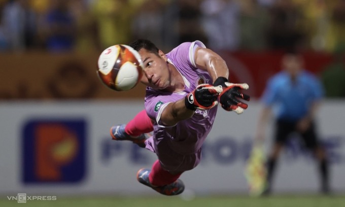 Filip Nguyễn đẩy bóng cứu thua từ cú sút của Đoàn Thanh Trường, trên sân Hàng Đẫy, Hà Nội tối 7/7/2023.