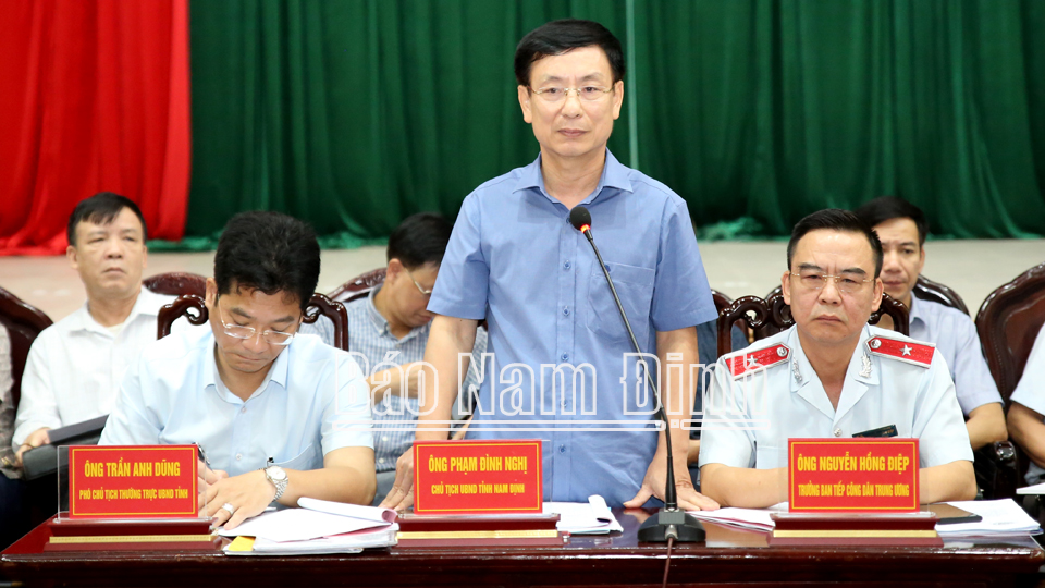 | Đồng chí Phạm Đình Nghị, Phó Bí thư Tỉnh ủy, Chủ tịch UBND tỉnh phát biểu tại buổi tiếp công dân huyện Nghĩa Hưng. |