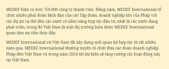(MEDEF) tại thủ đô Paris về tiềm năng hợp tác đầu tư và thương mại với các doanh nghiệp Pháp.