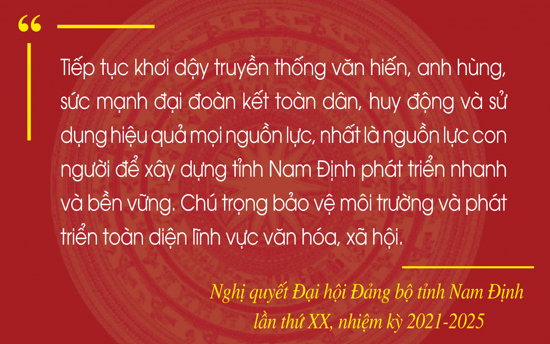 Phát huy truyền thống văn hiến của quê hương, tiếp thu tinh hoa văn hoá của dân tộc và nhân loại, Đảng bộ, chính quyền và nhân dân Nam Định quyết tâm xây dựng nền văn hóa và con người Nam Định phát triển toàn diện, hướng đến chân - thiện - mỹ, thấm nhuần tinh thần dân tộc, nhân văn, dân chủ và khoa học. Văn hóa thực sự trở thành nền tảng tinh thần vững chắc của xã hội, là sức mạnh nội sinh quan trọng bảo đảm sự phát triển bền vững và bảo vệ vững chắc Tổ quốc vì mục tiêu dân giàu, nước mạnh, dân chủ, công bằng, văn minh; đưa Nam Định sớm trở thành tỉnh khá của cả nước, xứng với niềm tin tưởng và tình cảm của Tổng Bí thư Nguyễn Phú Trọng với Đảng bộ, chính quyền và Nhân dân Nam Định.