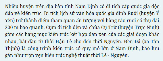 Toàn tỉnh Nam Định có hơn 1.300 di tích, trong đó có hai di tích quốc gia đặc biệt (gồm Di tích lịch sử và kiến trúc nghệ thuật Đền Trần và chùa Phổ Minh và Di tích kiến trúc nghệ thuật chùa Keo Hành Thiện).