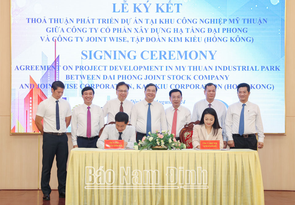| Lễ ký kết thỏa thuận hợp tác phát triển dự án trị giá gần 100 triệu USD với Tập đoàn nhôm Kim Kiều tại Khu công nghiệp Mỹ Thuận vào tháng 8/2024 (Ảnh: Viết Dư ) |