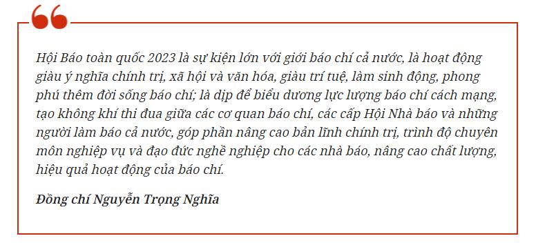 Phát biểu ý kiến khai mạc Hội Báo toàn quốc năm 2023, đồng chí Lê Quốc Minh, Ủy viên Trung ương Đảng, Tổng Biên tập Báo Nhân Dân, Phó Trưởng Ban Tuyên giáo Trung ương, Chủ tịch Hội Nhà báo Việt Nam, cho biết: Đây là ngày hội lớn của giới báo chí và công chúng cả nước, đồng thời là hoạt động thiết thực của giới báo chí trong việc đưa Nghị quyết Đại hội đại biểu toàn quốc lần thứ XIII của Đảng vào cuộc sống.