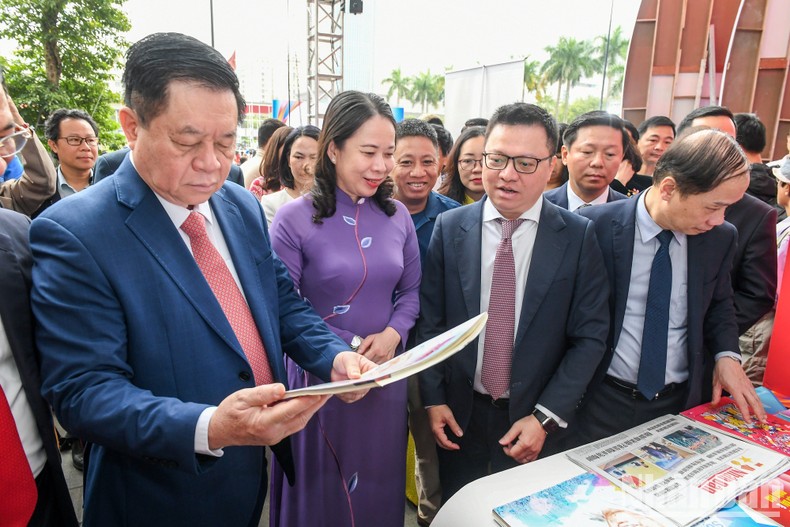 | Các lãnh đạo Đảng, Nhà nước và các đại biểu tham quan gian trưng bày của Báo Nhân Dân tại Hội Báo toàn quốc 2023. |