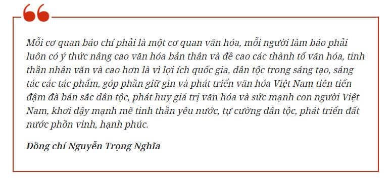 Mỗi cơ quan báo chí phải là một cơ quan văn hóa, mỗi người làm báo phải luôn có ý thức nâng cao văn hóa bản thân và đề cao các thành tố văn hóa, tinh thần nhân văn và cao hơn là vì lợi ích quốc gia, dân tộc trong sáng tạo, sáng tác các tác phẩm, góp phần giữ gìn và phát triển văn hóa Việt Nam tiên tiến đậm đà bản sắc dân tộc, phát huy giá trị văn hóa và sức mạnh con người Việt Nam, khơi dậy mạnh mẽ tinh thần yêu nước, tự cường dân tộc, phát triển đất nước phồn vinh, hạnh phúc.