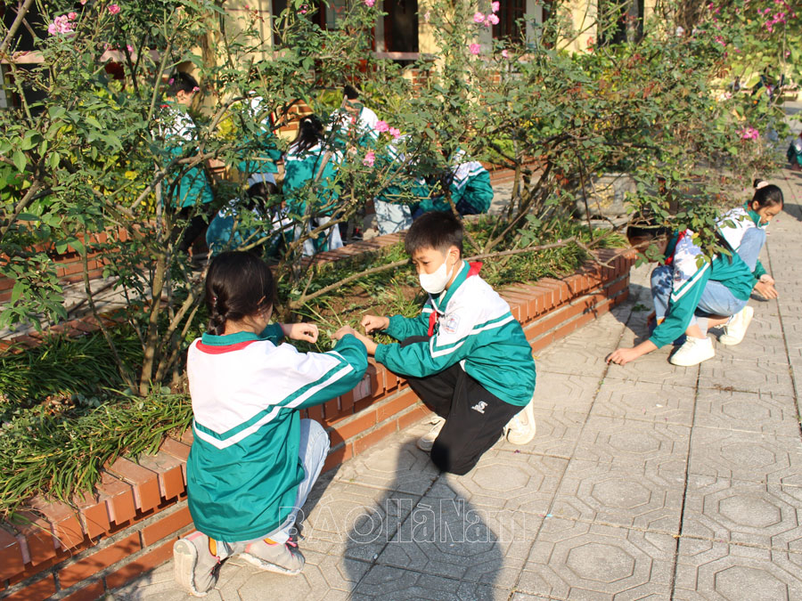 Như thường lệ, vào mỗi sáng đầu giờ, các em học sinh Trường Tiểu học Liêm Chính (thành phố Phủ Lý) chia ra từng nhóm để vệ sinh xung quanh khuôn viên trường, lau chùi sạch sẽ phòng học; chăm chút tỉa cành và tưới nước những bồn hoa, cây cảnh... Cô giáo Trần Hoàng Yến, Tổng phụ trách Đội Trường Tiểu học Liêm Chính cho biết: Thực hiện nội quy của nhà trường, vào đầu giờ sáng, các lớp sẽ làm nhiệm vụ vệ sinh lớp học của mình, nhặt rác, lá cây rụng xung quanh khuôn viên trường; tưới nước, nhặt cỏ tại các bồn hoa cảnh trước lớp và trong sân trường; lau, dọn các công trình măng non. Nhà trường vận động cha mẹ học sinh ủng hộ cây xanh để trang trí trước các lớp học; giao cho học sinh tự giác chăm sóc cây xanh, nâng cao ý thức BVMT. Nhờ đó, các lớp học đều được bố trí chậu hoa, cây cảnh, tạo không gian xanh mát cho lớp học có một khoảng xanh mát.