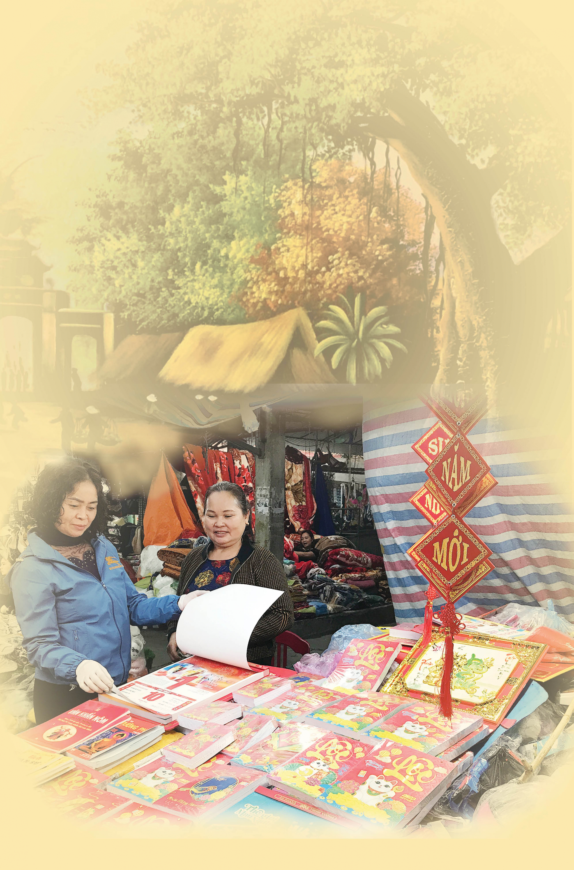 Khu vực bán rau xanh đầy ắp những rổ cà chua đỏ mọng, bắp cải, khoai tây béo tròn, những cây cải bẹ màu vàng mơ và hành, tỏi, gừng tươi, rau mùi, thì là thơm nồng nã. Gian hàng xén rực rỡ sắc màu của các đồ trang trí với những chuỗi dây kết hình đồng tiền, hoa mai, đèn lồng mini... níu chân bọn trẻ không muốn rời đi. Tay xách nách mang trĩu nặng, các bà, các mẹ vẫn không quên sắm thêm mấy cái rổ rá, giần sàng, con dao sắc, vài nông cụ cho gia đình để bắt tay vào mùa vụ mới. Chen vai thích cánh trong chợ quê vồn vã, niềm nở tiếng mời chào, hít hà hương thơm ngọt ngào của bánh rán mật, nhấm nháp vị bùi ngậy của chiếc bánh đa vừng giòn rụm, ta cũng vui lây khi ngắm nhìn những khuôn mặt hân hoan vì chọn mua được những món đồ ưng ý.