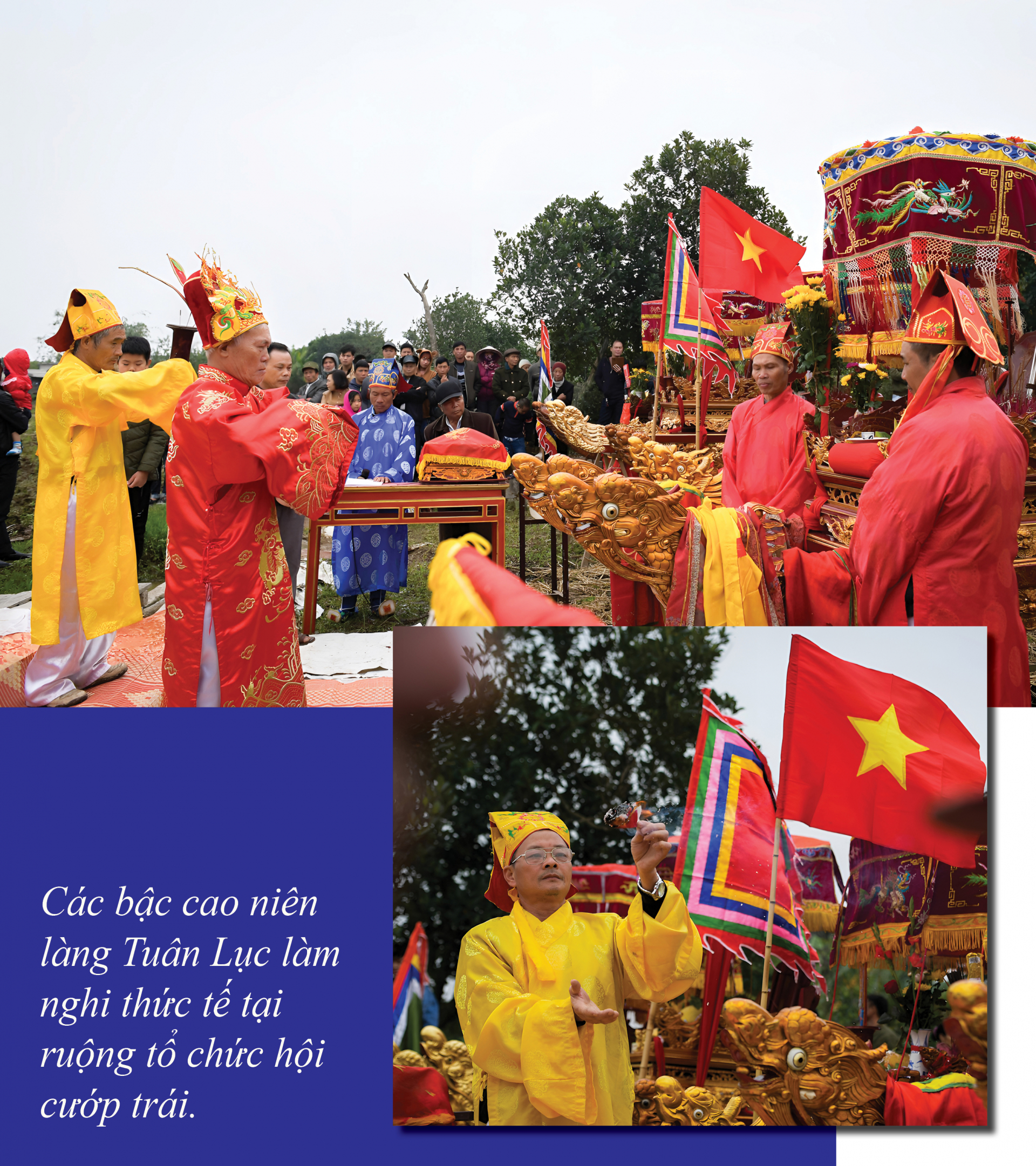 Lễ hội được tổ chức hàng năm nhưng hội cướp trái chỉ tổ chức vào các năm Tý, Ngọ, Mão, Dậu. Quả trái được làm bằng gốc dứa dại, gọt thành hình bầu dục. Ngày 23 tháng Chạp người dân trong làng chuẩn bị các lễ vật ra đền làng trình Thánh rồi đem quả trái vào hậu cung. Đến ngày lễ hội, quả trái được các cụ cao niên trong làng rước từ hậu cung ra hương án làm lễ Thánh trước sân đền. Sau đó, tổ chức giao trái, cướp trái khai hội. Hội cướp trái gồm 2 đội chơi, mỗi đội 30 nam giới. Tại địa điểm tổ chức cướp trái, người dân rước kiệu chọn lò cái. Khi chọn được lò cái, Ban tổ chức cắm cờ đào hố, theo mỗi hướng đông và tây cách nhau 50m, mỗi đội chơi sẽ tự đào hố lò con của bên mình. Hố của lò cái được Ban tổ chức tiến hành đào rộng, hình tròn hàm ếch. Khi đội hình được sắp xếp theo quy định, lệnh cướp trái vang lên bằng tiếng trống, sau đó Trưởng ban tổ chức ném trái xuống để hai đội cùng chơi cướp trái. Theo luật, người chơi chỉ được nắm vào khố của nhau để kéo, ngoài ra không được ôm, cầm tay chân và tuyệt đối không được đánh nhau. Bên nào cướp được trái nhanh nhất là thắng cuộc. Kết thúc cuộc chơi, Ban tổ chức lấy trái để lên kiệu Thành hoàng làng rước về đền và tạ ơn. Khác với lễ hội ở các nơi, hội cướp trái ở làng Tuân Lục không có giải nhất, nhì. Tham gia cướp trái, người thắng người thua đều vui vẻ, cùng được nhận lộc Thánh lấy may.