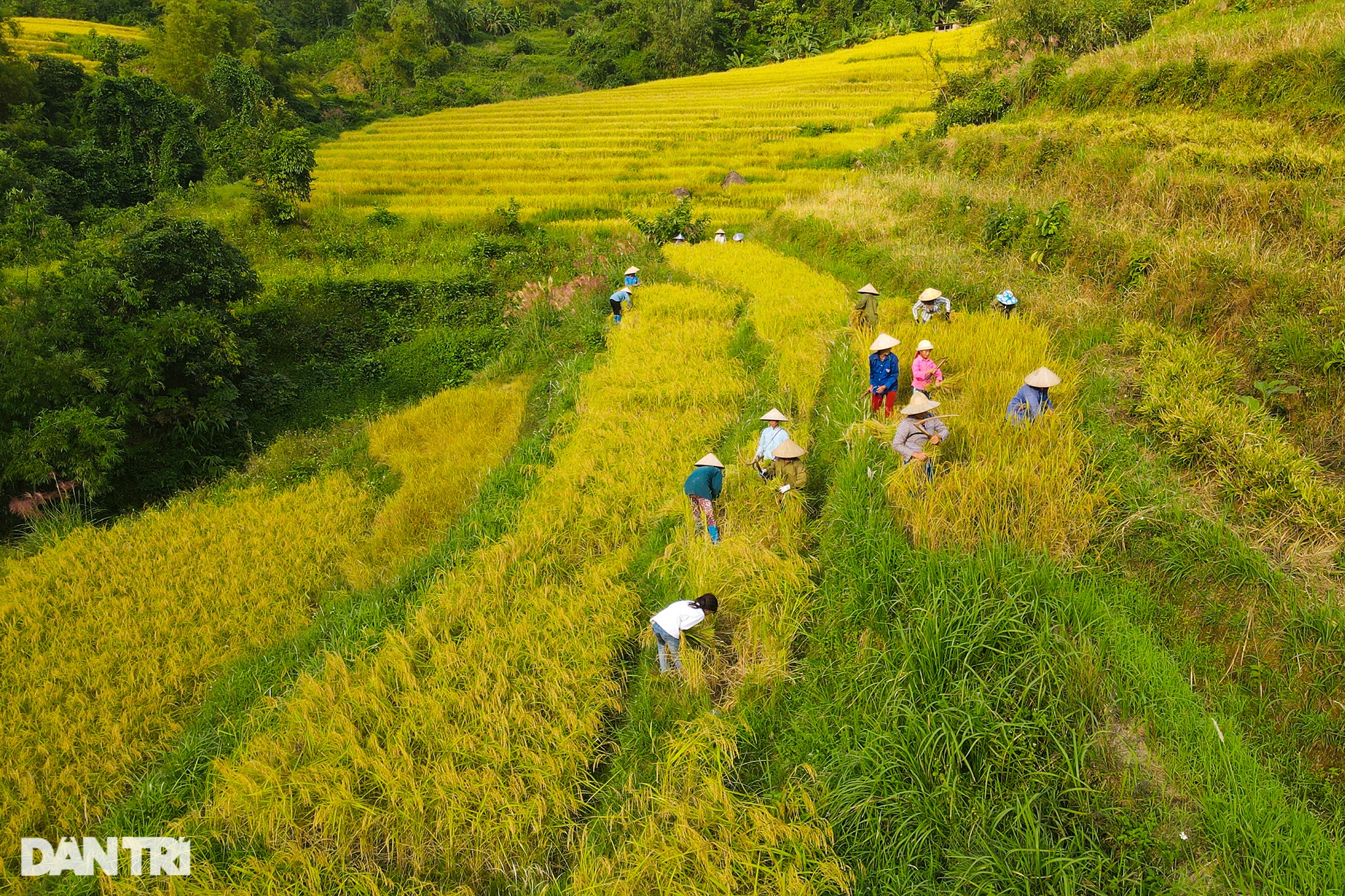 Đến hẹn lại lên, chúng tôi đến Tiên Yên vào một ngày đầu tháng 11. Sau vài chục phút từ thị trấn Tiên, trải nghiệm thú vị trên cung đường bạt ngàn màu xanh của cây rừng, những thửa ruộng bậc thang bát ngát thuộc xã Đại Dực hiện ra trước mắt (Ảnh: Đỗ Quân).Màu xanh của trời, của cái nắng cuối thu hanh hao vàng như rót mật và hơn cả là màu vàng rực rỡ của lúa chín tạo nên một bức tranh sinh động (Ảnh: An Nhiên).Khi chúng tôi đến, bà con dân tộc Sán Chỉ đang tổ chức gặt lúa, tiếng cười nói rộn ràng cả cánh đồng. Trên đường cái, thỉnh thoảng chúng tôi lại bắt gặp những thôn nữ trong trang phục của người Sán Chỉ (dân tộc sinh sống chủ yếu tại đây) với nụ cười tươi rói cùng cái gật đầu chào vô cùng mến khách (Ảnh: Đỗ Quân).Theo lãnh đạo huyện Tiên Yên, đa số diện tích lúa vụ mùa của các xã vùng cao huyện Tiên Yên được bà con canh tác trên những thửa ruộng bậc thang, cao thấp khác nhau, hình thành cảnh quan đặc trưng tại các xã vùng cao như Phong Dụ, Đại Thành, Đại Dực… Mùa gặt thường xuyên đón đông đảo các đoàn du khách đến chiêm ngưỡng, chụp ảnh (Ảnh: Đỗ Quân).