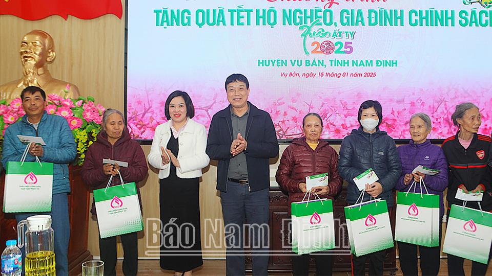 Nhân dịp đón Tết Nguyên đán Ất Tỵ 2025, trong 3 ngày 15, 16, 18/1, Công đoàn Chi nhánh Ngân hàng Chính sách xã hội (NHCSXH) tỉnh đã tổ chức tặng 70 suất quà Tết, mỗi suất gồm 1 triệu đồng tiền mặt và hiện vật cho các hộ nghèo và các đối tượng chính sách trên địa bàn thành phố Nam Định và các huyện Vụ Bản, Nam Trực.