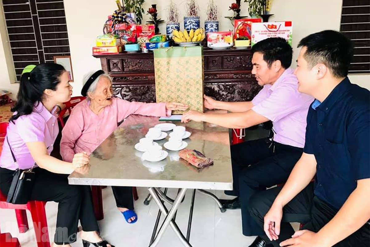 Cán bộ Ngân hàng CSXH chi nhánh Hà Nam thăm, tặng quà Mẹ Việt Nam Anh hùng Nguyễn Thị Hợp, sinh năm 1927, địa chỉ thôn đội 8, xã Tràng An, huyện Bình Lục.