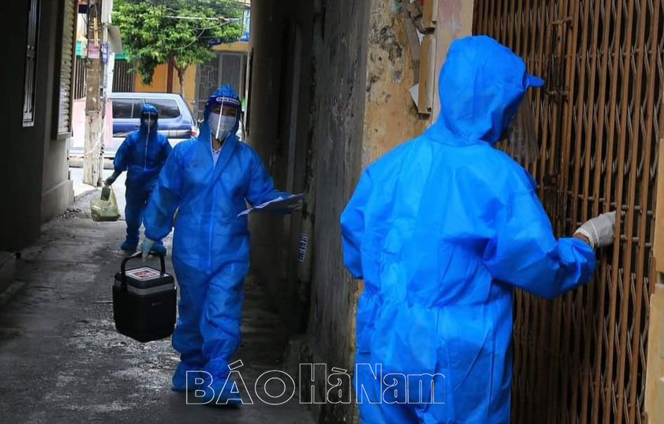 Lực lượng y tế đi từng ngõ, gõ cửa từng nhà ở Phủ Lý để thực hiện việc xét nghiệm sàng lọc SARS-CoV-2 cho người dân