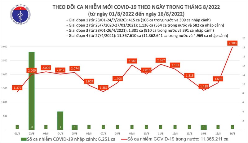 Ngày 16/8, bản tin phòng, chống dịch Covid-19 của Bộ Y tế cho biết, cả nước ghi nhận 2.983 ca Covid-19 mới, cao nhất trong 96 ngày qua. Trong ngày có 2 trường hợp tử vong tại Điện Biên và Quảng Ninh.