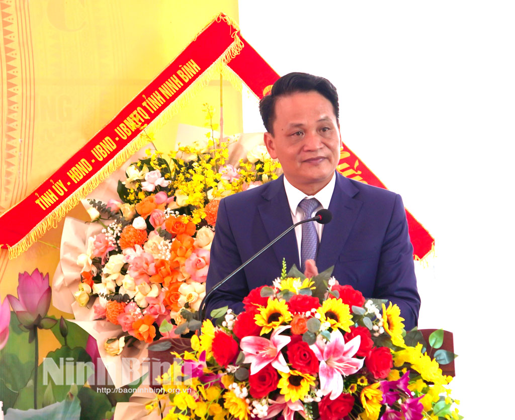 Đồng chí Đào Đình Tùng, Ủy viên Ban Thường vụ Tỉnh ủy, Bí thư Đảng ủy, Chủ tịch HĐND phường Phủ Lý tặng hoa chúc mừng cán bộ và nhân dân Khu dân cư Mễ Nội.