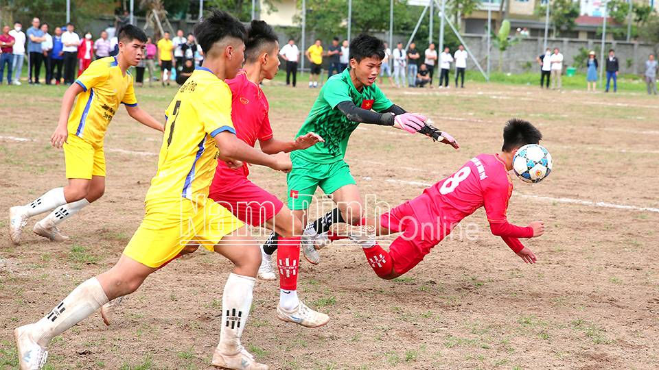 | Cầu thủ của Phòng GD và ĐT thành phố Nam Định (áo đỏ) nỗ lực phá bóng trước sức ép các cầu thủ Phòng GD và ĐT huyện Nam Trực (áo vàng). |