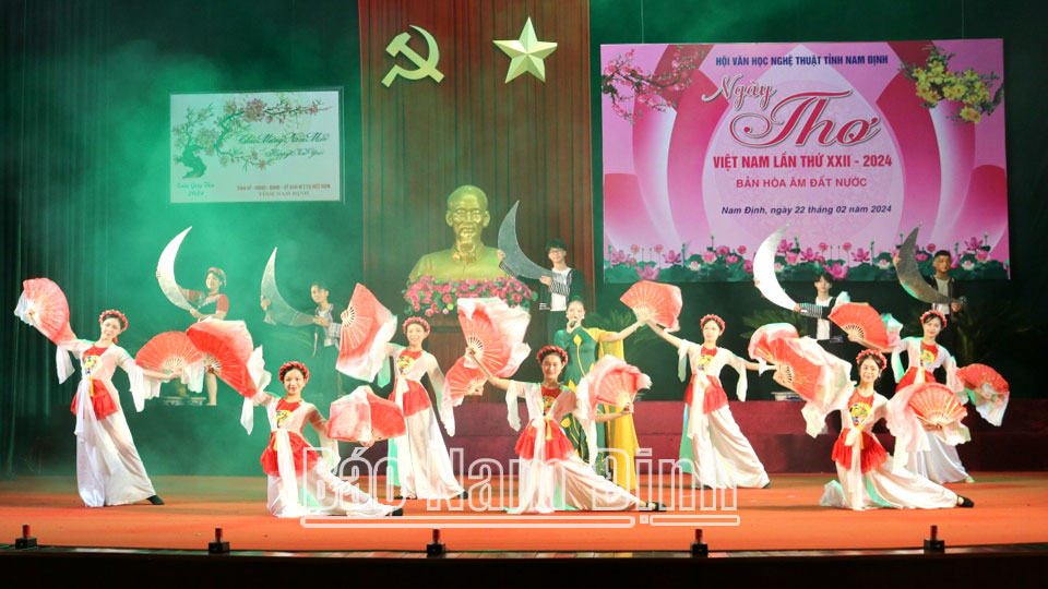 Chương trình Ngày Thơ Việt Nam năm nay với chủ đề “Bản hoà âm đất nước” gồm 2 phần: biểu diễn các tiết mục văn nghệ và giới thiệu một số tác giả, tác phẩm thơ Nam Định. Các ca sĩ, nghệ sĩ Trung tâm Văn hoá, Điện ảnh và Triển lãm tỉnh, hội viên các Bộ môn: thơ, âm nhạc - múa (Hội VHNT tỉnh), CLB thơ Thiên Bản (Vụ Bản), học sinh, sinh viên Trường Cao đẳng Văn hoá, Nghệ thuật và Du lịch Nam Định đã trình diễn các tiết mục thơ ca đặc sắc; tiêu biểu như: hoạt cảnh “Rằm tháng Giêng”; hát văn “Mùa trăng nhớ Bác”; ngâm thơ “Chân quê”; hát chèo “Tự hào Nam Định quê ta”; múa hát “Cánh đào Xuân”, “Nam Định vào Xuân”… Ngày Thơ Việt Nam thực sự là sân chơi bổ ích của những người yêu thơ quê hương Nam Định, tôn vinh những giá trị văn hoá của thơ ca trong đời sống tinh thần xã hội./.