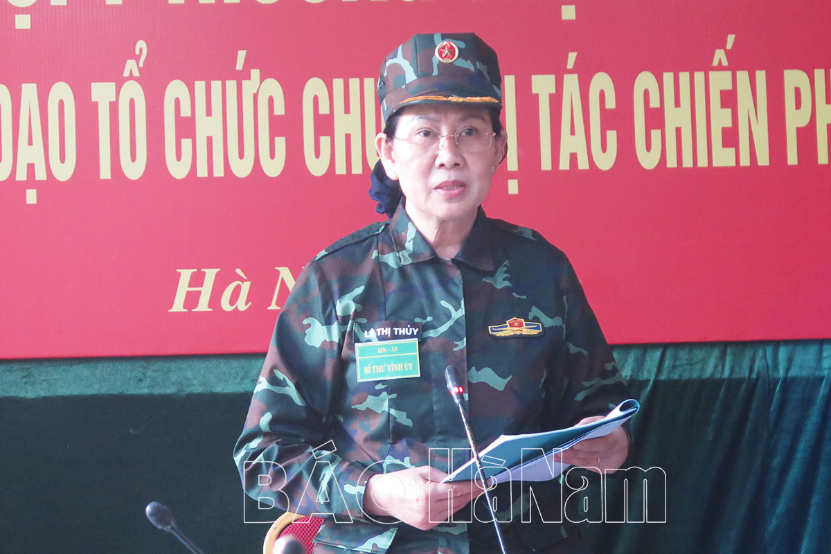 Hội nghị hội ý thường trực Tỉnh ủy trong diễn tập.Đồng chí Lê Thị Thuỷ, Ủy viên Trung ương Đảng, Bí thư Tỉnh ủy, Chủ tịch HĐND tỉnh, Trưởng Ban chỉ đạo diễn tập tỉnh điều hành hội nghị diễn tập.Đồng chí Đinh Thị Lụa, Phó Bí thư thường trực Tỉnh uỷ, Phó Ban chỉ đạo diễn tập tỉnh phát biểu tại hội nghị diễn tập.Đồng chí Trương Quốc Huy, Phó Bí thư Tỉnh uỷ, Chủ tịch UBND tỉnh, Trưởng đoàn Đại biểu Quốc hội tỉnh, Trưởng Ban tổ chức diễn tập tỉnh triển khai nhiệm vụ tại hội nghị diễn tập.