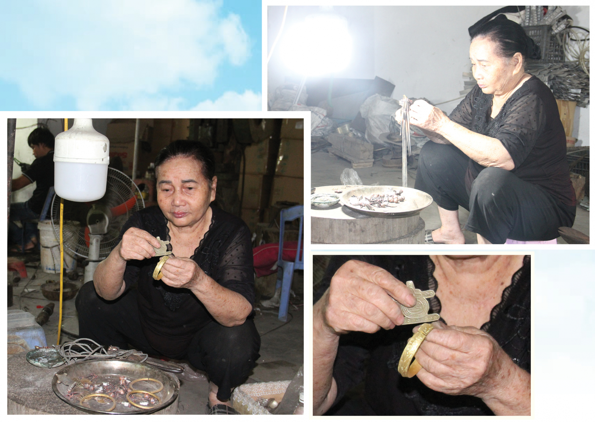 | Cụ bà Lê Thị Tuyết, thôn Vĩnh Trị, đã hơn 70 tuổi vẫn cặm cụi với nghề làm trang sức truyền thống. |