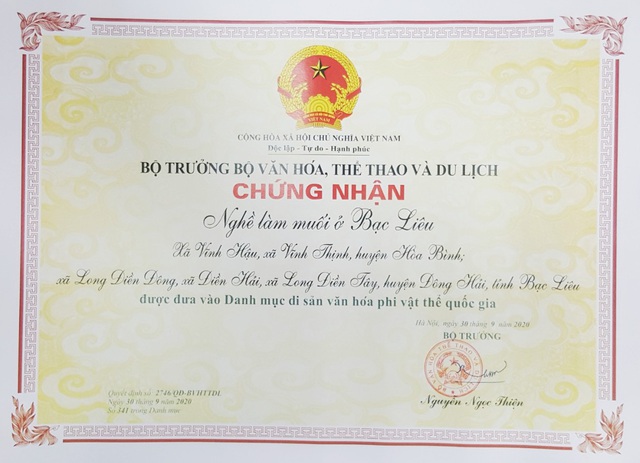 Cuối tháng 9/2020, Bộ Văn hóa, Thể thao và Du lịch có quyết định đưa "Nghề làm muối ở Bạc Liêu" vào danh mục Di sản văn hóa phi vật thể Quốc gia. Đây là căn cứ pháp lý để tỉnh Bạc Liêu bảo tồn và phát huy nghề thủ công truyền thống làm muối.