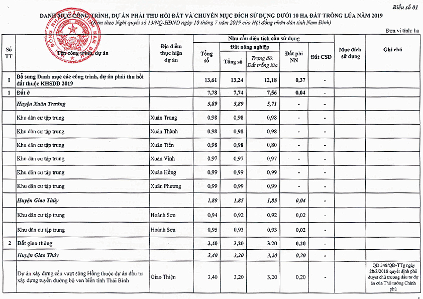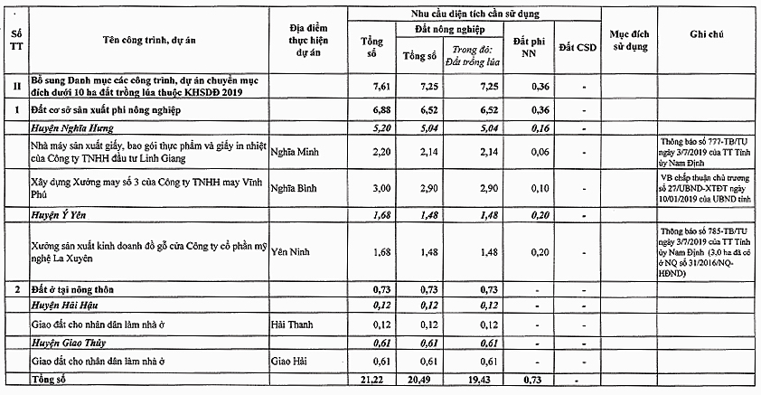 V/v chấp thuận bổ sung danh mục các công trình, dự án phải thu hồi đất và phê duyệt bổ sung danh mục các công trình, dự án chuyển mục đích sử dụng đất trồng lúa dưới 10ha năm 2019 trên địa bàn tỉnh Nam Định; điều chỉnh diện tích, tên chủ đầu tư, tên dự án trong danh mục công trình, dự án đã được Hội đồng nhân dân tỉnh phê duyệt