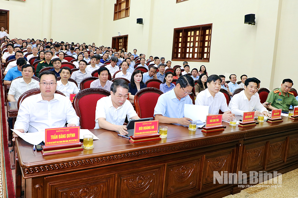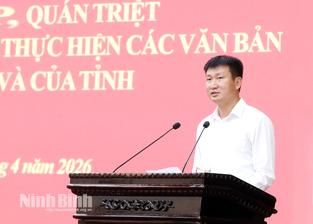 Đồng chí Bí thư Tỉnh ủy Trần Huy Tuấn cũng đã giới thiệu, quán triệt Kết luận số 213-KL/TW, ngày 21/11/2025 của Ban Bí thư về tiếp tục thực hiện Chỉ thị số 42-CT/TW, ngày 24/3/2020 của Ban Bí thư về tăng cường sự lãnh đạo của Đảng đối với công tác phòng ngừa, ứng phó, khắc phục hậu quả thiên tai; Kết luận số 219-KL/TW, ngày 26/11/2025 của Bộ Chính trị về tiếp tục thực hiện Nghị quyết số 19-NQ/TW, ngày 16/6/2022 của Ban Chấp hành Trung ương Đảng khóa XIII về nông nghiệp, nông dân, nông thôn đến năm 2030, tầm nhìn đến năm 2045; Chỉ thị số 54-CT/TW, ngày 30/11/2025 của Bộ Chính trị về tăng cường sự lãnh đạo của Đảng đối với công tác giám định tư pháp và định giá tài sản; Nghị quyết số 05-NQ/TU, ngày 30/1/2026 của Ban Chấp hành Đảng bộ tỉnh về xây dựng Ninh Bình trở thành thành phố trực thuộc Trung ương trước năm 2030.