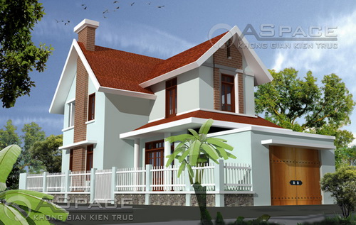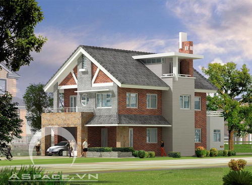 Vật liệu theo ngôn ngữ mộc mạc tự nhiên của gạch trần nâu đỏ, mái dốc ghi xám, kết hợp với các chi tiết trang trí như ống khói, ô thoáng giếng trời.