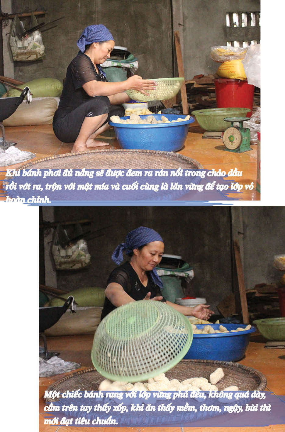 "> Sau thời gian phơi từ 3-4 lần nắng, bánh được cất đi từ 3-4 ngày, sau đó mới được đem ra rán nổi trong mỡ rồi trộn bánh với mật mía trưng và cuối cùng là lăn trong vừng để tạo lớp vỏ bánh hoàn chỉnh. Bánh tốt nhất phải được phơi bằng nắng tự nhiên, tuy nhiên người phơi phải chú ý không được phơi lúc trời nắng rát hoặc quá mát.