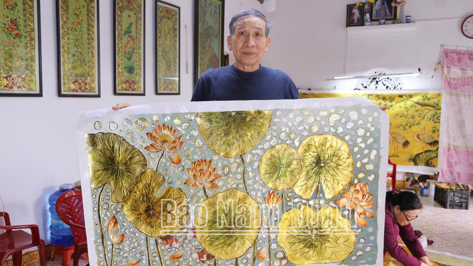 | Ông Nguyễn Xuân Dưỡng, xã Hải An (Hải Hậu) sáng tạo tác phẩm dòng tranh sơn mài thếp vàng. |