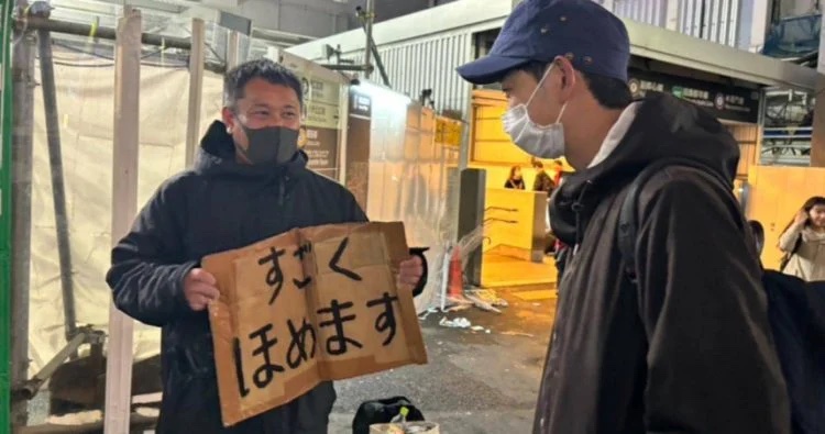 Một người đàn ông trung niên Nhật Bản, có biệt danh “chú khen ngợi”, đã kiếm sống bằng cách đứng trên đường phố và khen ngợi người lạ.