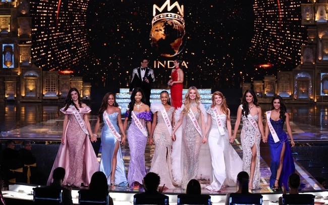Ảnh: Miss World Top 8 trên sân khấu chung kết.