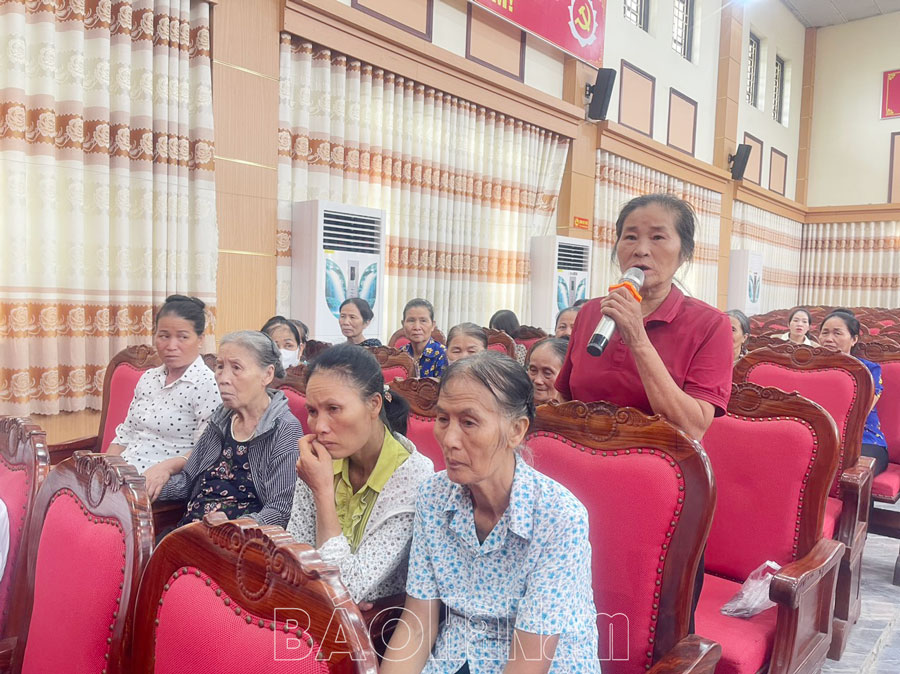 Đại diện CBĐVHV và nhân dân Hoàng Tây nêu đề xuất, kiến nghị với đại diện cấp ủy, chính quyền địa phương về những khó khăn, vướng mắc trong thực hiện chủ trương, chính sách pháp luật của Đảng, Nhà nước; trong thực hiện các chỉ tiêu nghị quyết của cấp ủy các cấp, nhất là thực hiện chỉ tiêu Nghị quyết Đại hội Đảng bộ xã nhiệm kỳ 2020-2025. Cụ thể, đại diện CBĐVHV và nhân dân thôn Yên Lão, Thọ Lão 1, 3... đặt câu hỏi đối với đồng chí chủ tịch UBND xã về định hướng của xã trong việc chuyển đổi cơ cấu cây trồng, vật nuôi trong thời gian tới? Việc đào tạo nghề gắn với giải quyết việc làm để thu hút ĐVTN tham gia các lớp đào tạo nghề; việc mở các lớp tập huấn áp dụng tiến bộ KHKT vào sản xuất để nâng cao năng suất chất lượng cây trồng, vật nuôi. Có ý kiến phản ánh, hiện tại các nghĩa trang nhân dân xuất hiện tình trạng 1 số hộ gia đình tổ chức xây quây nhận đất cho gia đình nhà mình với diện tích rộng. Vậy giải pháp nào để tháo gỡ hiện tượng trên? Cùng đó, có ý kiến bày tỏ băn khoăn hiện việc chi trả trợ cấp xã hội qua tài khoản ngân hàng là hoạt động tất yếu phù hợp với xu hướng chuyển đổi số. Tuy nhiên, việc áp dụng với người cao tuổi, người khuyết tật đang có bất cập. Người già ít dùng điện thoại thông minh. Nếu có dùng thì cũng không được thành thạo, điểm rút tiền lại xa nhà (trong khi đó những trường hợp này thường là già yếu, đi lại khó khăn) nên chủ yếu phụ thuộc vào sự hỗ trợ của người thân. Do đó, đề nghị xã kiến nghị cấp trên cần có sự linh hoạt trong triển khai thực hiện, phân loại các đối tượng chi trả trợ cấp xã hội qua tài khoản ngân hàng phù hợp và theo nguyện vọng của người dân. Một số ý kiến đề nghị lãnh đạo địa phương đưa ra giải pháp để đảng viên trẻ làm việc tại các công ty tham gia sinh hoạt chi bộ thường xuyên và việc thực hiện quy chế dân chủ ở cơ sở trong xây dựng nông thôn mới đối với các công trình xây dựng cơ sở hạ tầng của xã nói chung công trình của thôn nói riêng; kế hoạch thực hiện xây dựng các ngõ còn lại của thôn Thọ Lão 1 trong thời gian tới...