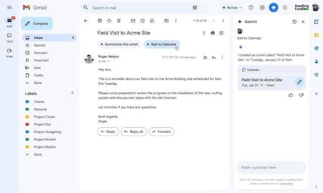 Tính năng mới của Gmail được phát triển dựa trên công nghệ Gemini AI của Google đã bắt đầu hoạt động từ ngày 10.3. Khi nhận được email có thông tin chi tiết về sự kiện, một số người dùng Gmail sẽ thấy nút "Add to Calendar". Gemini AI sẽ tự động quét email và phát hiện các thông tin quan trọng liên quan đến lịch trình.