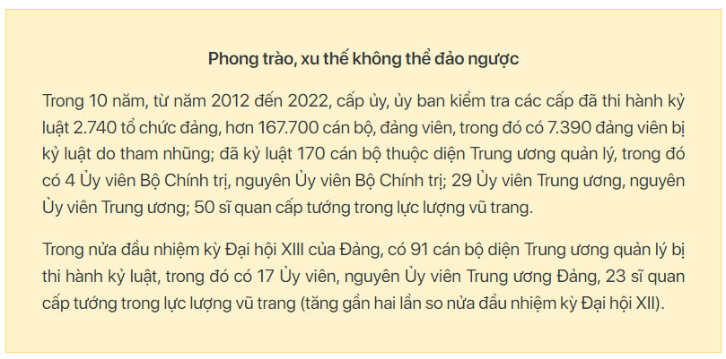Công tác xây dựng, chỉnh đốn Đảng được làm từ lâu, nhưng chưa bao giờ quyết liệt như hiện nay, từng bước đi vào chiều sâu, bài bản, hiệu quả. Con số cán bộ, đảng viên bị xử lý hằng ngày được thông tin công khai kịp thời trên các phương tiện truyền thông. Không phải ai cũng biết rằng, để đưa ra một kết luận như vậy, các cơ quan đã phải cẩn trọng như thế nào, Tổng Bí thư đã phải trăn trở như thế nào. Có như thế mới thực hiện được tinh thần nhiều lần đồng chí cảnh cáo, "không có vùng cấm", "không có ngoại lệ", bất kể người đó là ai. Dù rất đau lòng, nhưng không thể không làm vì sự nghiệp chung; xử lý kỷ luật một vài người để cứu muôn người.
