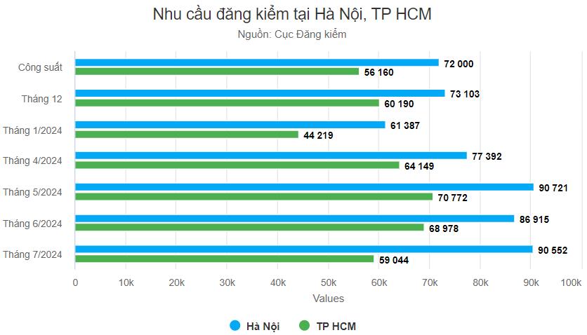 Hà Nội có 28 trung tâm với 50 dây chuyền kiểm định đang hoạt động trong tổng số 31 trung tâm, công suất kiểm định 72.000 xe mỗi tháng. Tuy nhiên, tháng 12 lượng xe có nhu cầu đăng kiểm trên toàn thành phố là hơn 73.000 và tăng vọt vào giữa năm 2024 với khoảng 77.000-90.000 xe mỗi tháng, có thể gây quá tải tại các đơn vị đăng kiểm.