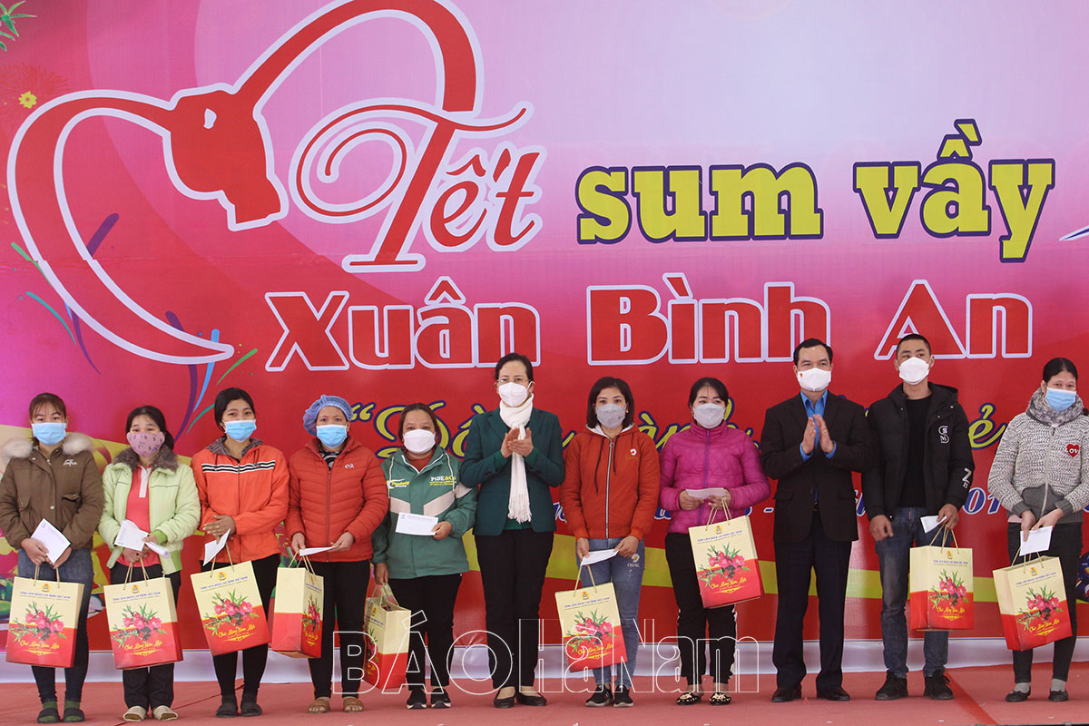 Đồng chí Lê Thị Thủy, Ủy viên Trung ương Đảng, Bí thư Tỉnh ủy, Chủ tịch HĐND tỉnh và đồng chí Nguyễn Đình Khang, Ủy viên Trung ương Đảng, Chủ tịch Tổng LĐLĐ Việt Nam trao quà Tết cho công nhân.Đồng chí Phó Bí thư Thường trực Tỉnh ủy Đinh Thị Lụa và đồng chí Chủ tịch UBND tỉnh Trương Quốc Huy trao quà Tết cho CNLĐ.