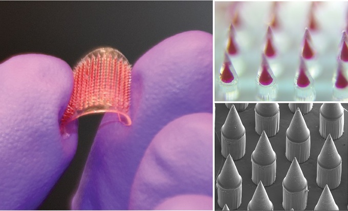 Các vi kim trong miếng dán có kích thước bằng chân tóc, chứa vaccine được truyền qua lớp biểu bì của da. Ảnh: NVCC.