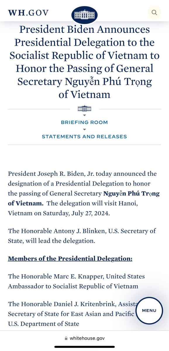 Nhà Trắng công bố Phái đoàn đại diện Tổng thống Hoa Kỳ sang Việt Nam viếng Tổng Bí thư Nguyễn Phú Trọng