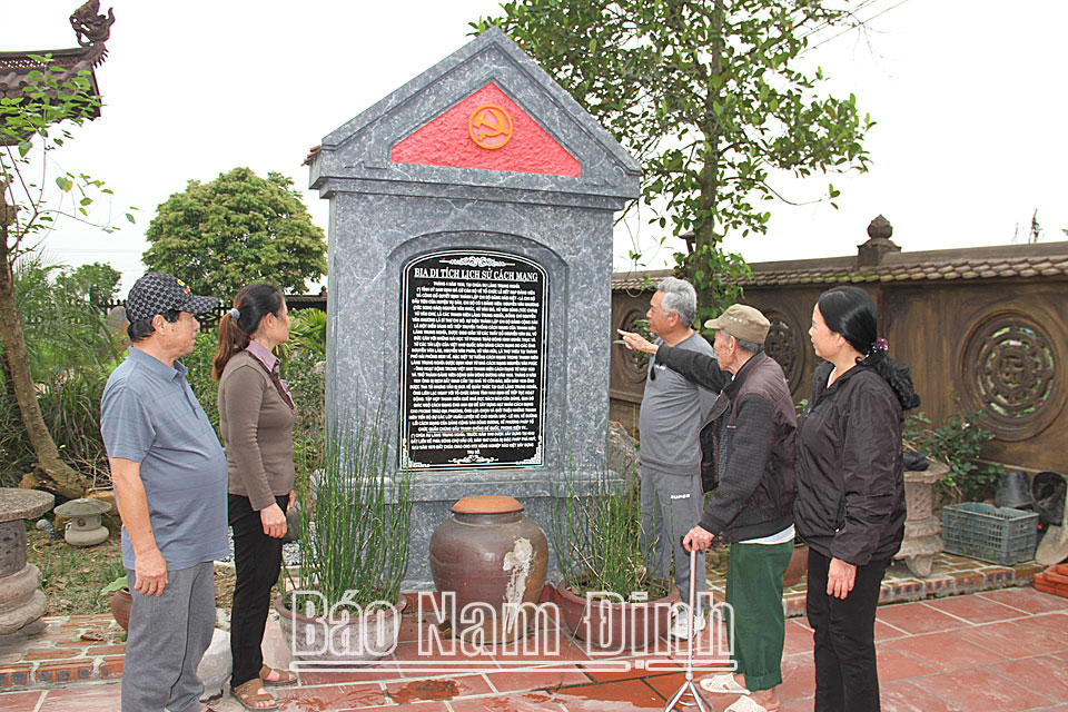 | Cán bộ và nhân dân thôn Trung Nghĩa thuyết minh về Tấm bia di tích lịch sử, cách mạng về nơi thành lập chi bộ Đảng Cộng sản Đông Dương đầu tiên của huyện Vụ Bản. |