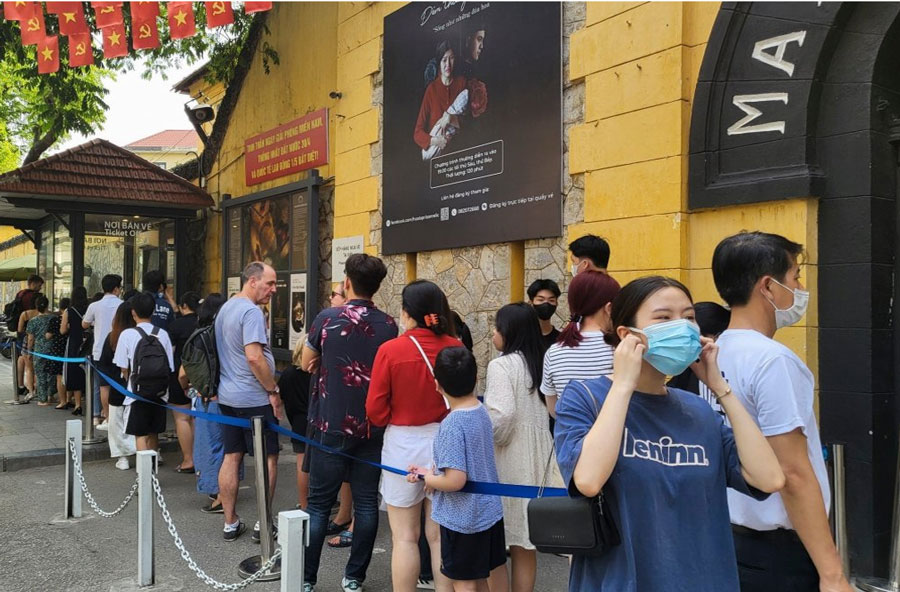 Du khách xếp hàng mua vé vào Nhà tù Hoả Lò ngày 2/5. Ảnh: Anh Tú
