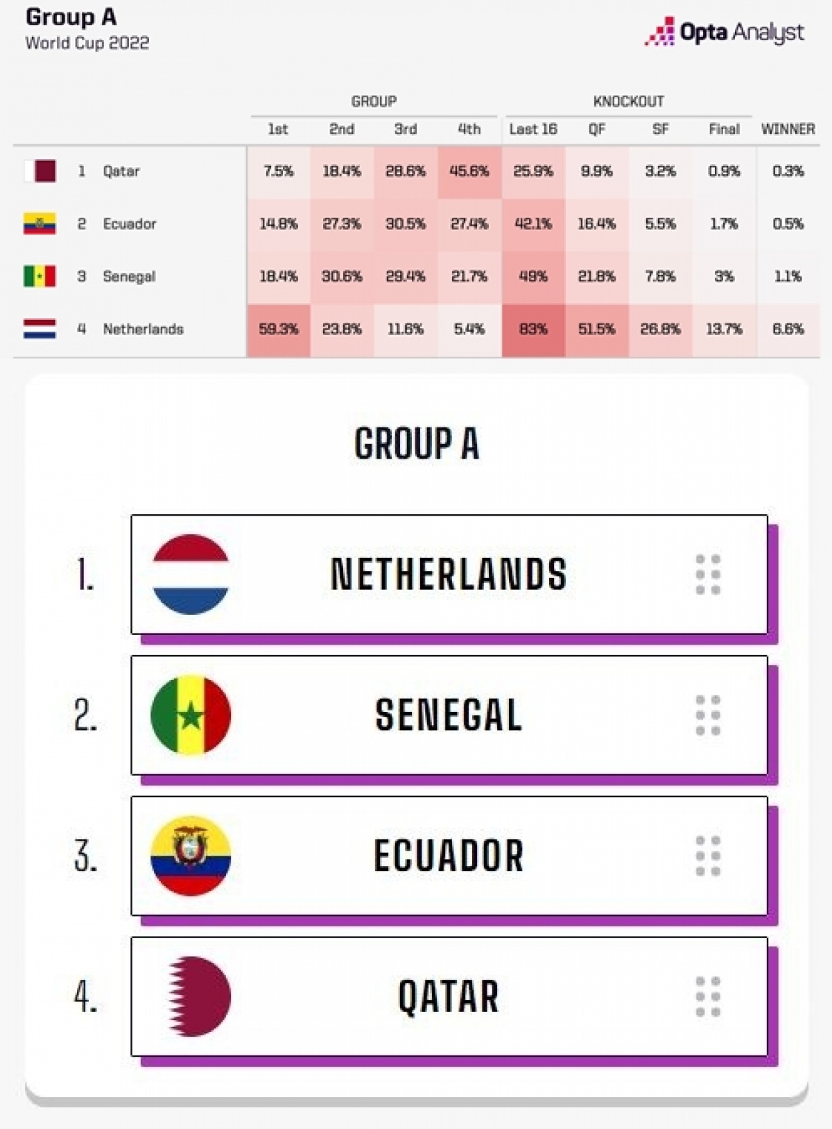 Theo đánh giá của Opta Analyst, Hà Lan là đội có cơ hội lớn nhất ở bảng A. Phân tích số liệu cho thấy, khả năng Hà Lan đứng nhất bảng A là 59,3% và khả năng vô địch World Cup 2022 là 6,6%.