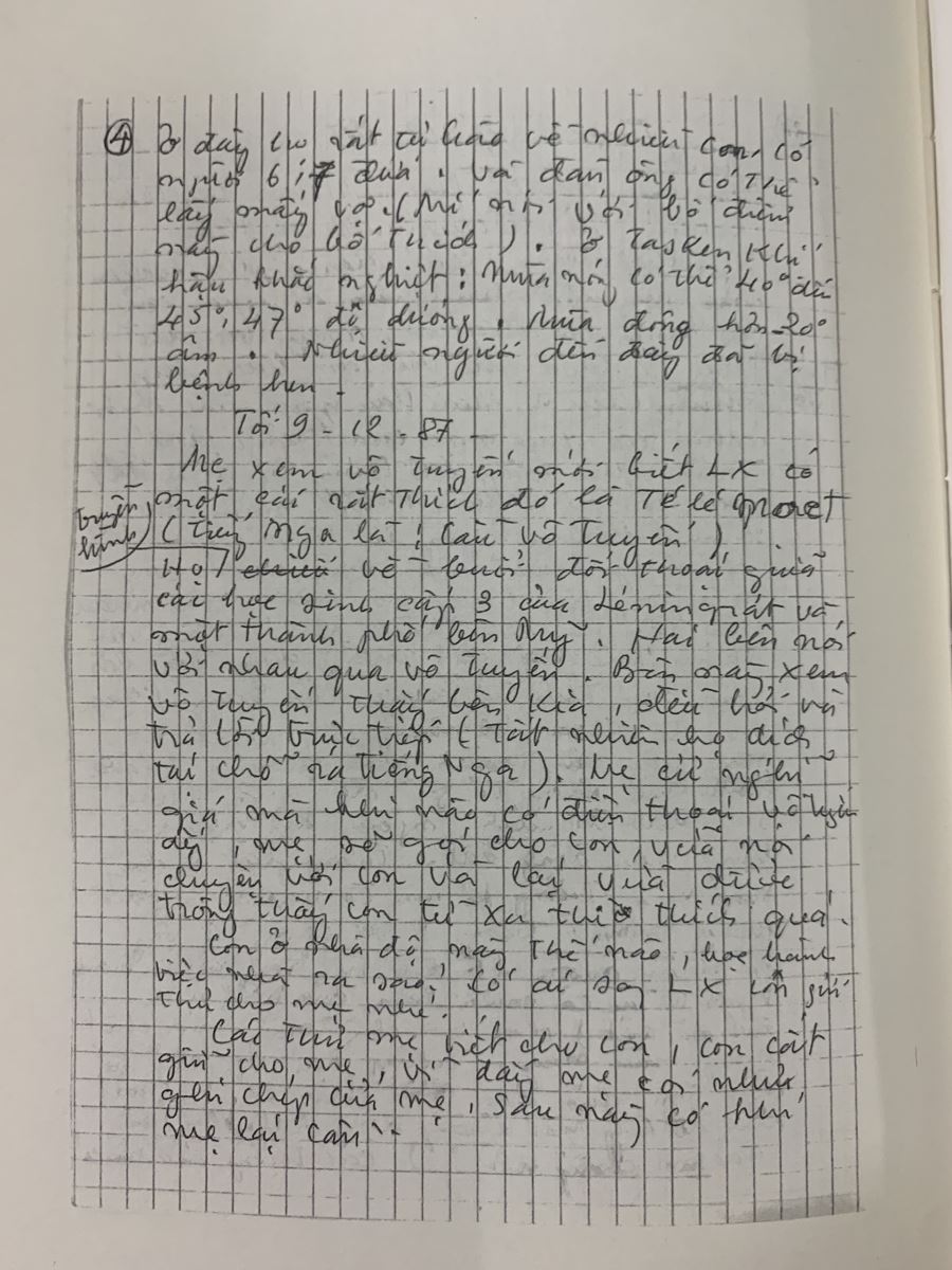 “Mẹ đi trên con đường chiến tranh. Thức với trăng qua những bến phà, hố bom, vết đạn, pháo sáng dày đặc. Mẹ đi qua như qua những buồn vui của đời mẹ, những con đường chiến tranh này luôn luôn có cái chết rình bên cạnh, nhưng mẹ không sợ bằng lúc mẹ bắt đầu đi, vượt qua cái tình cảm gia đình (xa con).Qua những đêm thức trắng, xe càng đi càng vào miền nóng bức – hằng ngày nhớ con nên mẹ lại cảm thấy gần con hơn”.