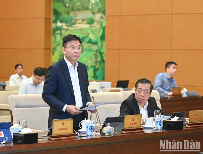| Bộ trưởng Tư pháp Lê Thành Long trình bày báo cáo tại phiên họp. |
