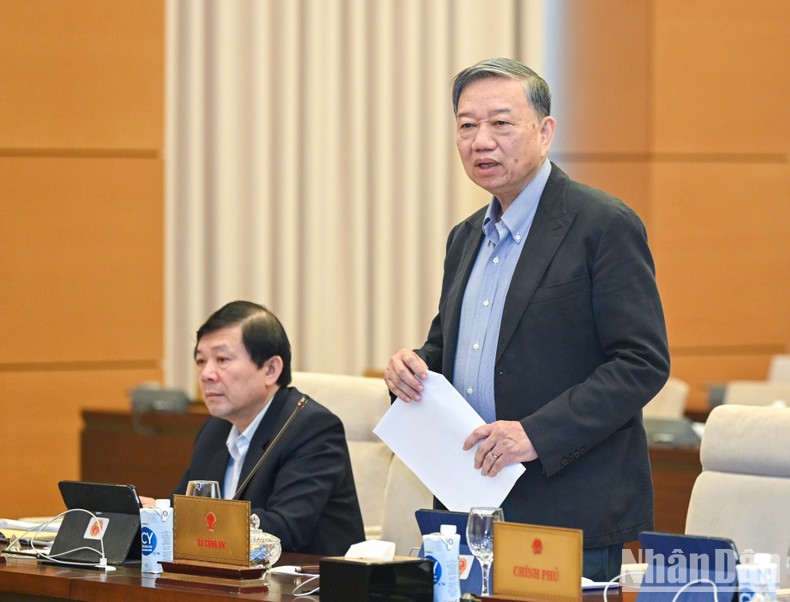 | Bộ trưởng Công an Tô Lâm phát biểu ý kiến tại phiên họp. |