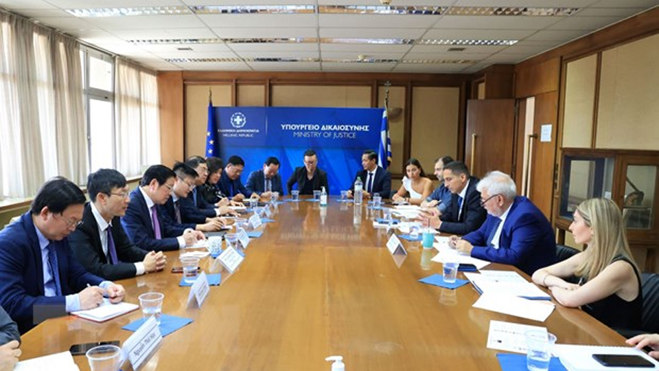 | Buổi làm việc giữa Đoàn đại biểu Đảng Cộng sản Việt Nam với Tổng Thư ký, Thứ trưởng Thường trực Bộ Tư pháp Hy Lạp Panos Alexandris. (Ảnh: TTXVN) |