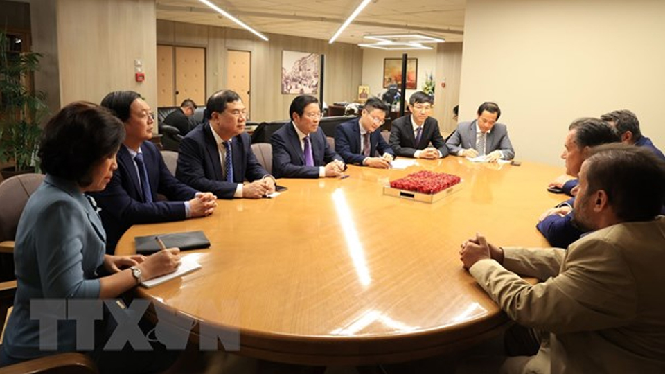 | Quang cảnh buổi làm việc giữa Đoàn đại biểu Đảng Cộng sản Việt Nam và Phó Chủ tịch Đảng Dân chủ Mới cầm quyền, Bộ trưởng Lao động Hy Lạp Adonis Georgiadis. (Ảnh: TTXVN) |