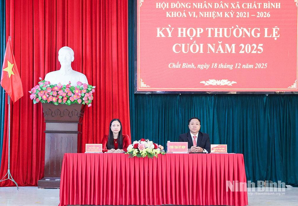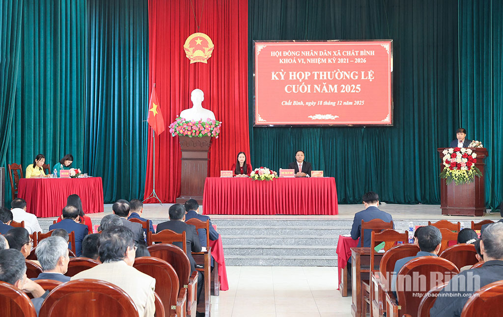 * Sáng 18/12, HĐND xã Chất Bình khoá VI, nhiệm kỳ 2021-2026 tổ chức khai mạc Kỳ họp thường lệ cuối năm 2025 (kỳ họp thứ 4). Kỳ họp tập trung xem xét, thảo luận, đánh giá và thông qua: báo cáo kết quả thực hiện nhiệm vụ phát triển kinh tế - xã hội (KT-XH) năm 2025; phương hướng, nhiệm vụ phát triển KT-XH năm 2026 và các vấn đề quan trọng khác.
