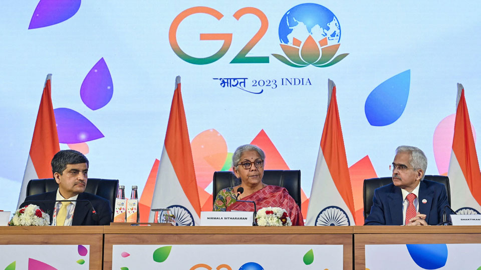 | Bộ trưởng Tài chính Ấn Độ Nirmala Sitaraman (giữa) phát biểu tại cuộc họp báo sau khi kết thúc Hội nghị Bộ trưởng Tài chính và Thống đốc ngân hàng Trung ương Nhóm G20 tại Bengaluru, Ấn Độ, ngày 25-2-2023.