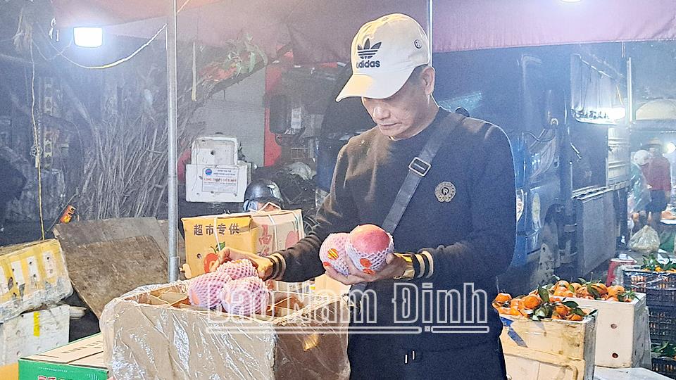 Không chỉ ở chợ đêm Phạm Ngũ Lão, những ngày này chợ đêm hoa quả khu vực đường Trần Hưng Đạo - Lý Thường Kiệt diễn ra sôi nổi hơn bao giờ hết. Theo các thương lái, chợ bắt đầu hoạt động từ 12 giờ đêm đến khoảng 5-6 giờ sáng là tan. Đối với các mặt hàng hoa quả, thời điểm đông nhất là vào những ngày rằm, mùng một, ngày lễ và đặc biệt là dịp Tết Nguyên đán. Anh Phạm Thanh Huy, một thương lái cho biết: “Ngày nào cũng vậy, dù mưa gió, rét đến mấy nhà tôi cũng vẫn có mặt tại chợ từ rất sớm để cung ứng hàng hóa cho khách. Các loại trái cây được lấy từ các tỉnh nên mùa nào cũng phong phú. Hàng được lấy tận gốc, đạt mẫu mã, chất lượng, giá cả cũng “mềm” nên dễ tiêu thụ”. Xen lẫn tiếng còi xe, tiếng í ới gọi nhau của thương lái và người mua là những câu hỏi quen thuộc: “Quýt hôm nay giá thế nào? Táo có giảm hơn không”, “Nay có bưởi gì, có thêm phật thủ không…”. Trong cái giá lạnh của đêm cuối năm, người bán, người mua đều tất bật nhưng hầu như không có ai to tiếng. Nhìn những cô, những chị bên ngoài khoác thêm những chiếc áo mưa, chiếc khăn choàng ra ngoài lớp áo ấm có thể nhận thấy họ là những “dân buôn” đến lấy hàng đem về các chợ dân sinh bán lẻ. Nhiều người đến từ các huyện, trên chiếc xe máy “cà tàng” nhưng có thể chở được hàng tạ hàng với lủng củng những thùng xốp chồng lên nhau. Cô Hương, đến từ thị trấn Cổ Lễ (Trực Ninh) cho biết, cô lấy hàng tại chợ đêm này đã được gần 5 năm. Trước đây, không đi xa lấy hàng được cô phải lấy lại từ người khác nên khi nhập phải đội lên mấy giá. Hiện tại việc buôn bán khó khăn, nhiều người mở mặt hàng này nên cô phải chịu khó đội mưa gió đi xa, lấy công làm lãi.